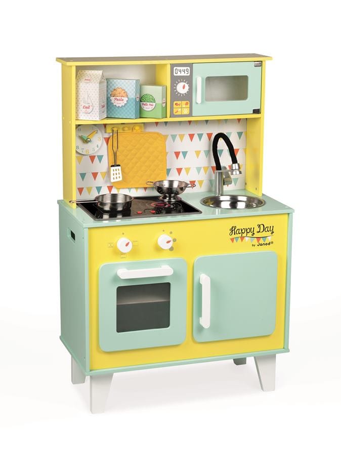 Velká dřevěná kuchyňka pro děti od 3 do 8 let má realistický vzhled. Kuchyňka je vybavená mikrovlnkou, varnou deskou, dřezem a troubou. Součástí kuchyňky je i polička na koření a potraviny, hodiny, věšák na doplňky, otvírací skříňka ve spodní části. Varná deska svítí a vydává zvuky jako ve skutečné kuchyni. Varná deska po zapnutí svítí jako opravdový sklokeramický vařič. Součástí této kuchyňky je 7 různých doplňků – sítko, hrnec, obracečka, chňapka, těstoviny, hrášek a mléko v papírových krabičkách. Rozměr kuchyňky je : 55x30x87cm