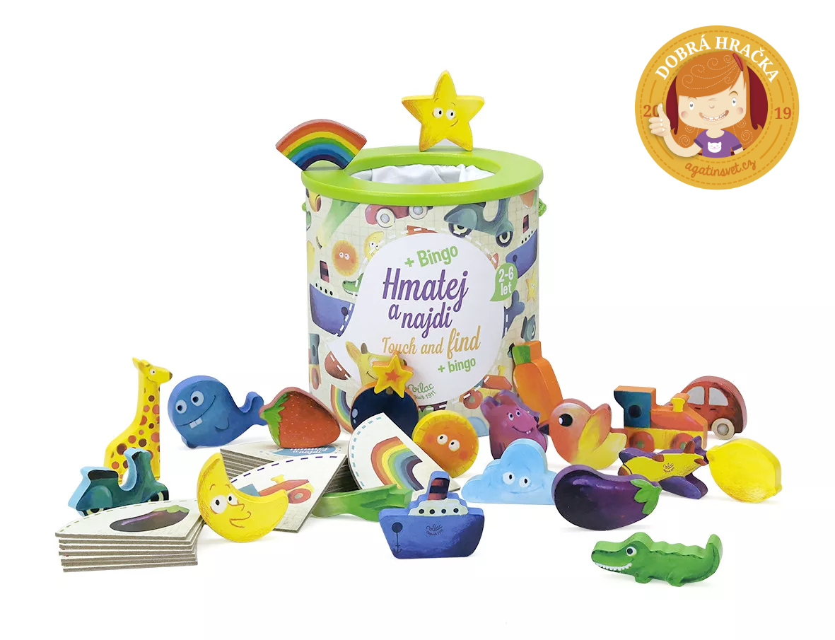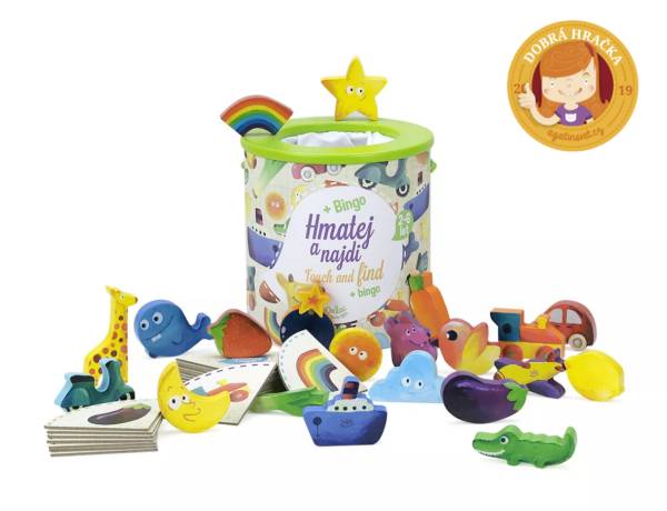 Zábavná didaktická hra Hmatej a najdi rozvíjející dětem hmat a představivost. Dřevěné předměty jsou skryté v látkovém pytlíku nebo v neprůhledném obalu – tubě. Menší děti mají za úkol po vložení ruky do tuby nebo pytlíku jen na základě hmatání popsat svými slovy, jaký předmět drží v ruce. Do hry se mohou zapojit i rodiče a jít tak dětem názorným příkladem. Starší děti mohou hrát hru ve formě lota nebo binga, k těmto hrám jsou k dispozici obrázkové karty jednotlivých předmětů.