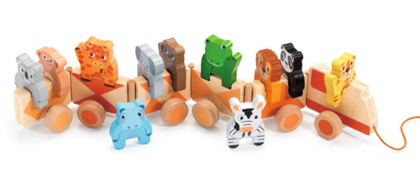 Vyčarujte malým dětem úsměv na tváři tímto velkým a barevným dřevěným vlakem, jehož pasažéři jsou zvířata z džungle. Děti si mohou umisťovat 11 zvířat na 6 vagónů a poté je tahat pomocí provázku. Navíc se se zvířátky dají vymýšlet další hry, když vystoupí z vlaku. Zvířátka lze stavět na sebe do pyramidy. Nebo si mohou děti hrát jen tak a vymýšlet příběhy. Kola vláčku jsou při jízdě tichá a nerachtají. Hračka je ideální pro děti od 18 měsíců.