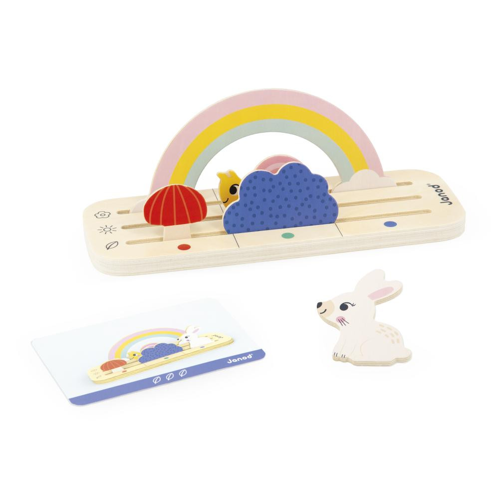 Dřevěná základna, na které jsou umístěny značky, králík, hlemýžď, housenka, houba, beruška na listech, strom, duha, keř, 12 oboustranných karet šablon na reprodukci se 3 úrovněmi obtížnosti. Rozměry balení jsou 22 x 7,7 x 1,2 cm. Vyrobeno ze dřeva a kartonu s certifikací FSC®.