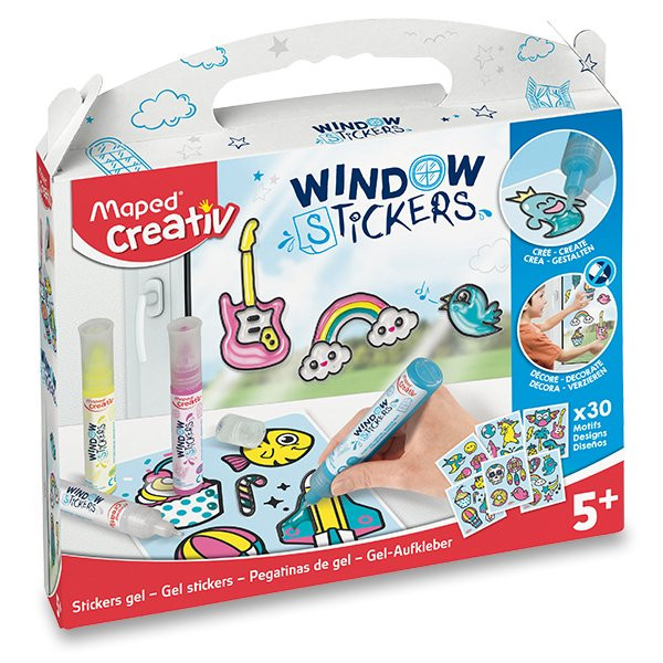 Kreativní sada obsahuje 30 šablon a 5 tub s barvou pro vytvoření vlastních samolepek na okno. Dají se použít i na lednici, monitor či display telefonu. Přilnou také na porcelán a glazovanou keramiku. Šablony mají trendy motivy. Jemný hrot tuby zajišťuje přesné kontury.